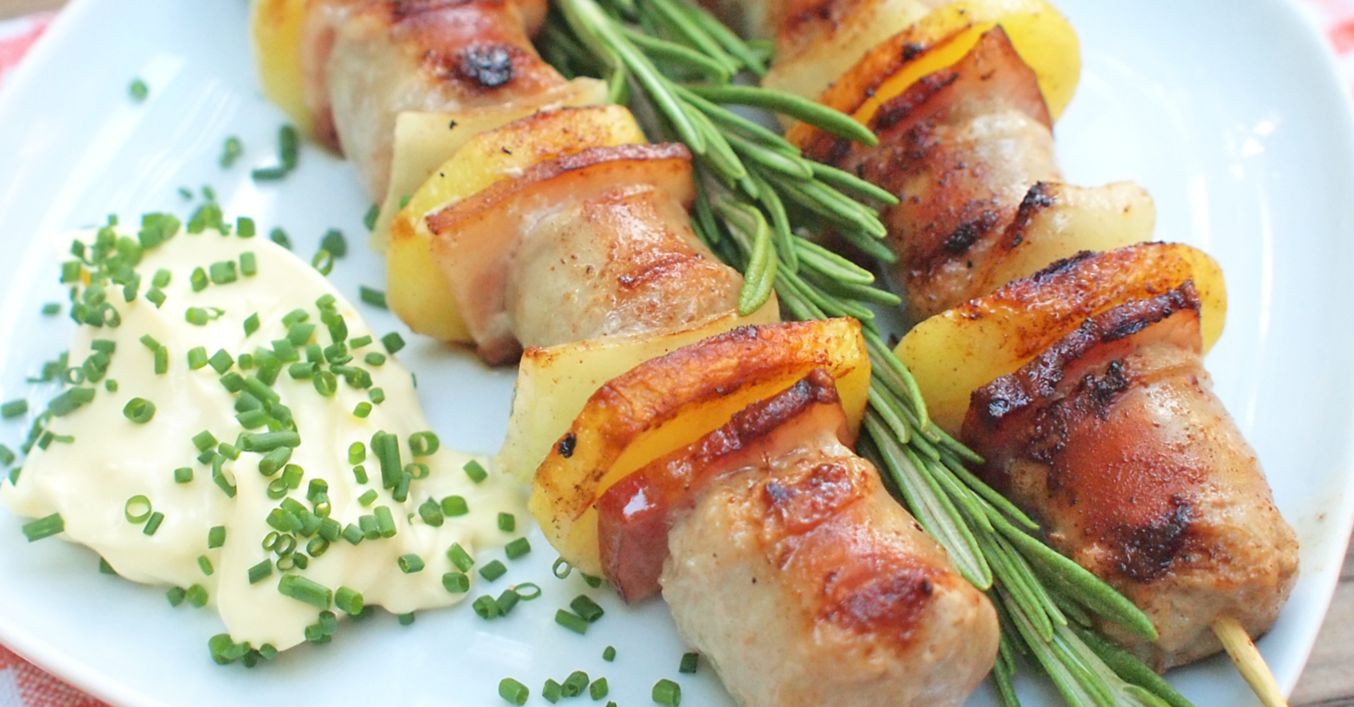 Na špíz pak střídavě napichujeme díly klobásy, špek, plátky brambor a cibuli. Grilujeme na středně rozehřátém grilu z obou stran (dohromady asi 10 až 12 minut). Poté ihned podáváme.