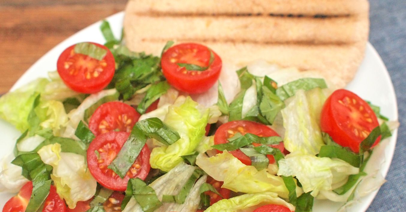 Rajčata, bazalku a salát promícháme v míse s olivovým olejem a octem. Osolíme, opepříme a podáváme s grilovaným chlebem pita.