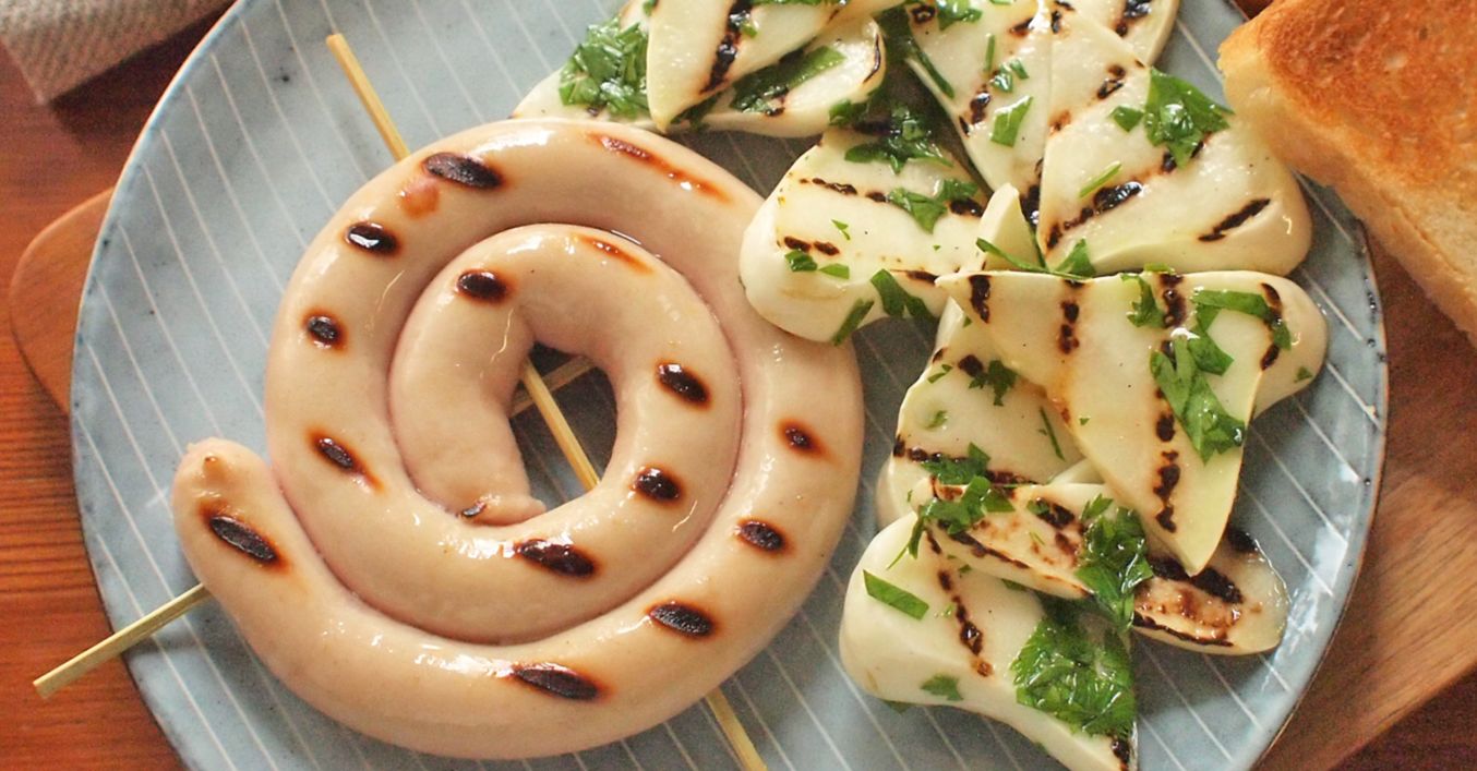 Vinnou klobásu rozdělíme na 4 díly, svineme do spirály a propíchneme špejlí.