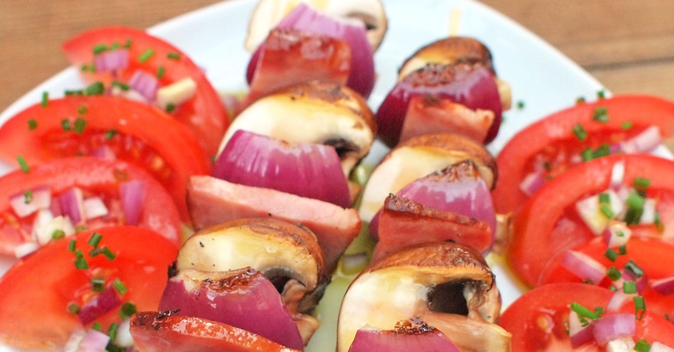 Cibuli oloupeme, rozpůlíme a rozebereme na plátky. Slaninu nakrájíme na plátky, které zkrátíme na menší čtverce. Žampiony očistíme, osolíme, opepříme a potřeme olejem.