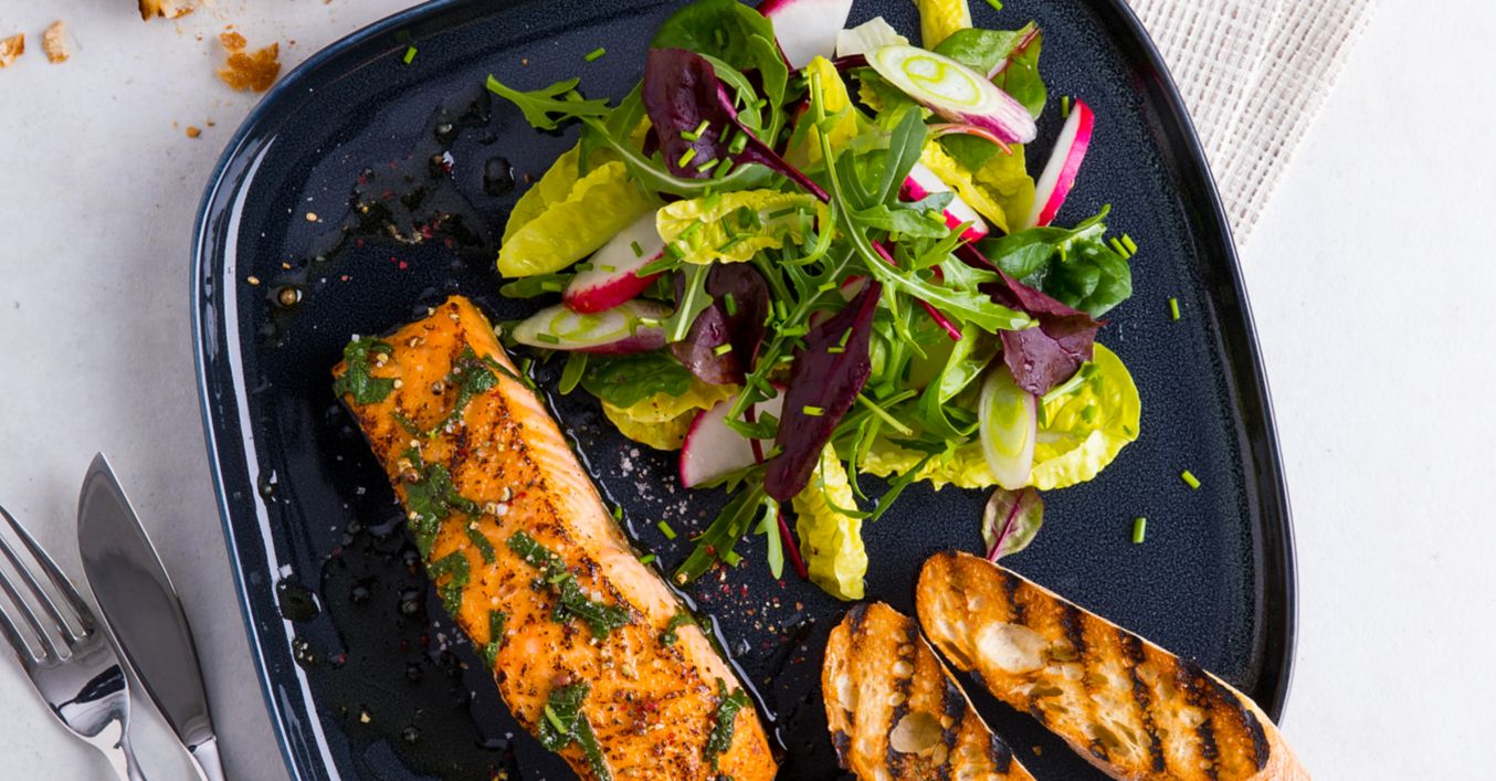 Těsně před podáváním smícháme zálivku se salátem a podáváme spolu s grilovanou rybou.