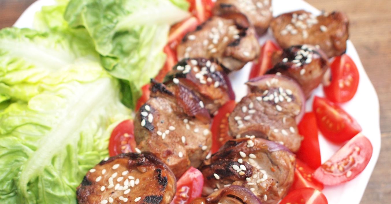 Když je maso namarinované, sestřeseme přebytečnou marinádu a střídavě s cibulí kostky masa napícháme na špízy.