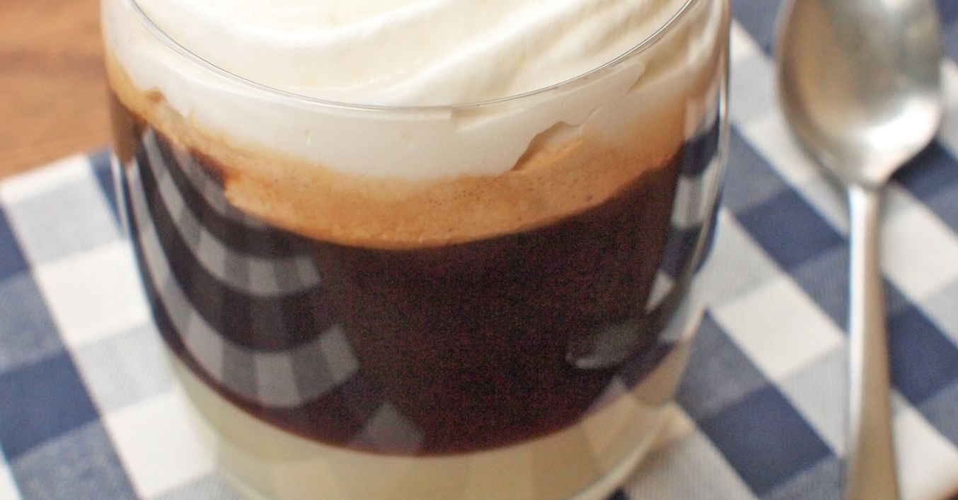 Do sklenice nalijeme kávu a přes lžičku po stěně přidáme vaječný koňak. Zdobíme čepicí ze smetany.
