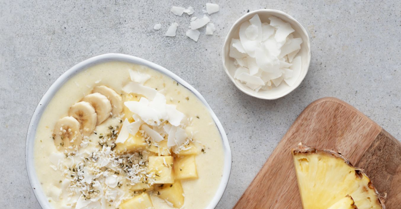 Ananas, banán, řecký jogurt a kokosové mléko rozmixujte najemno. Vlijte do misky a ozdobte kostičkami ananasu, plátky banánů, konopnými semínky, kokosem a kokosovými plátky. Hned podávejte.