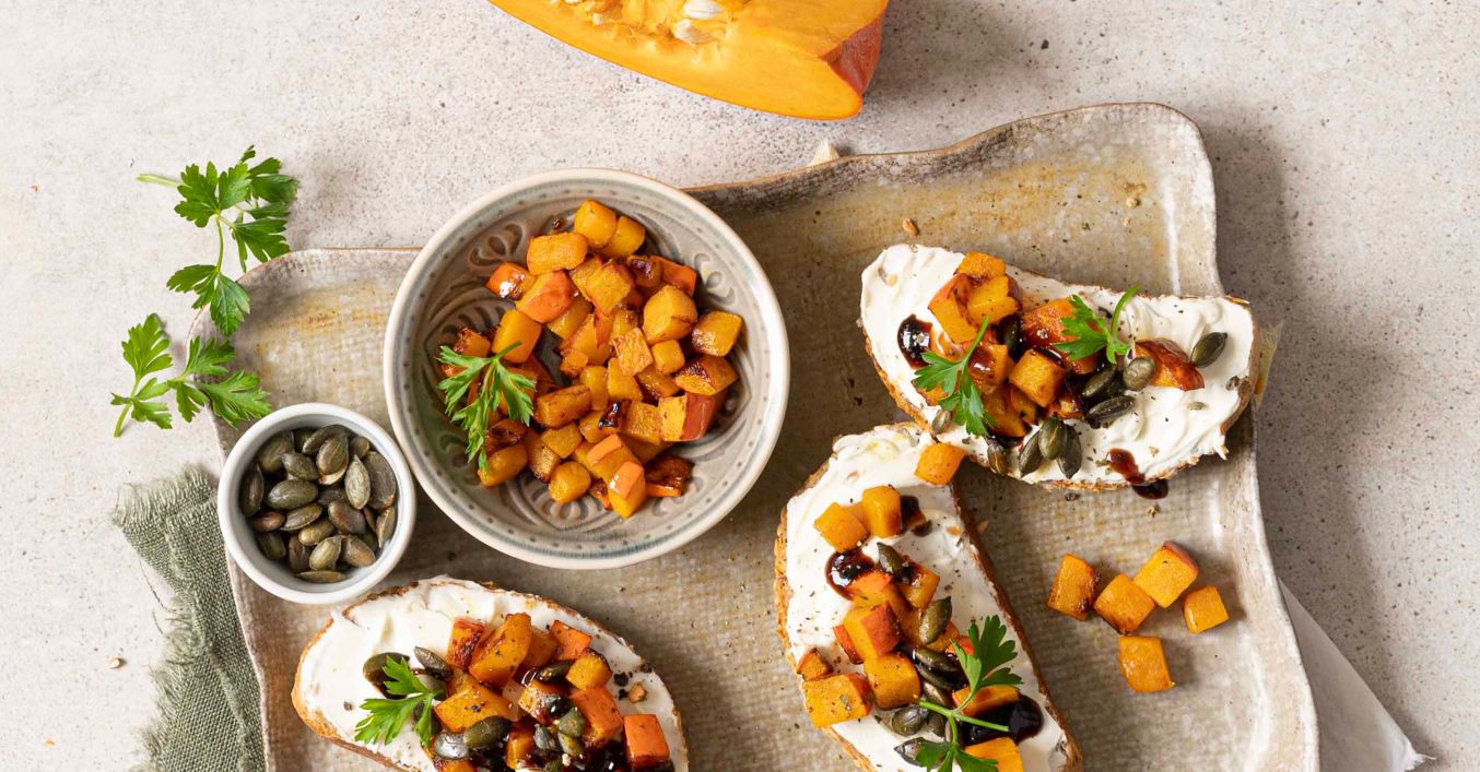 Plátky baget potřete smetanovým sýrem. Na něj dejte opečenou dýni a dýňová semínka. Pokapejte balzamikovou redukcí a ozdobte čerstvou petrželkou. Hned podávejte.
