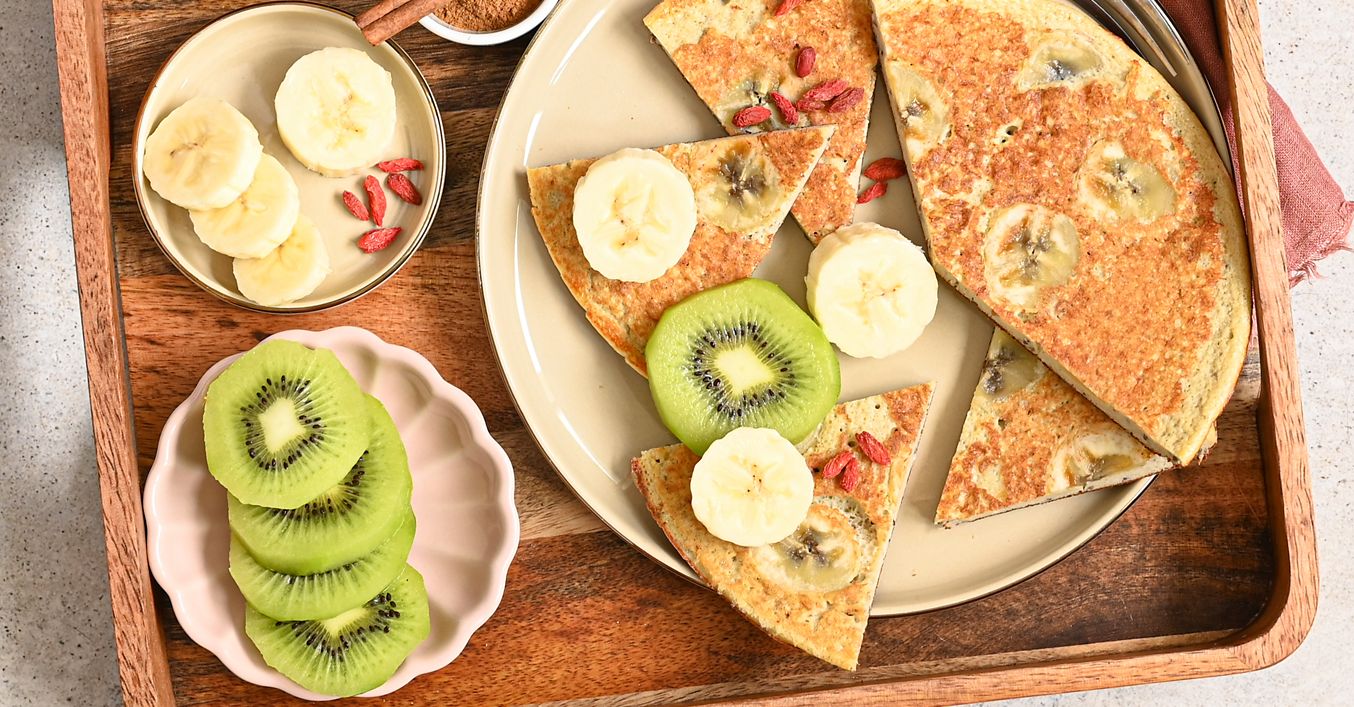 Omelety nakrájejte na kousky. Podávejte s čerstvým ovocem.