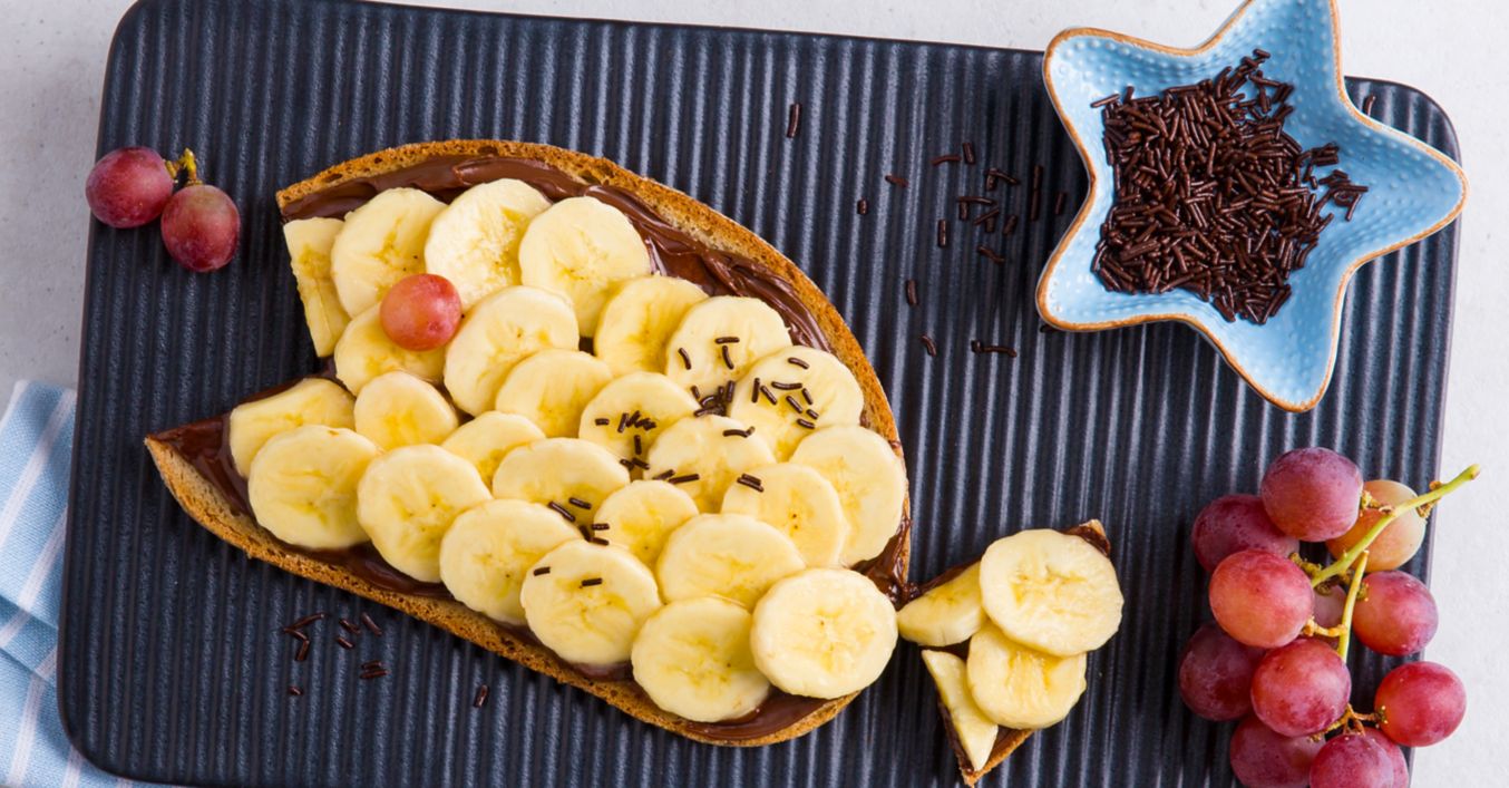 Půlky hroznů položte na krajíce chleba jako rybí oči. Banánové rybí sendviče posypte podle potřeby čokoládovými hoblinkami a podávejte.