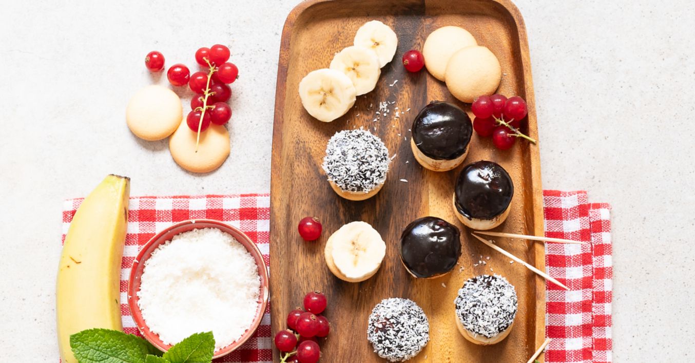 Mezi dva kusy dětských piškotů dejte kolečko banánu. Piškoty s banánem spojte párátkem a poté obalte v čokoládové polevě. Posypejte strouhaným kokosem.