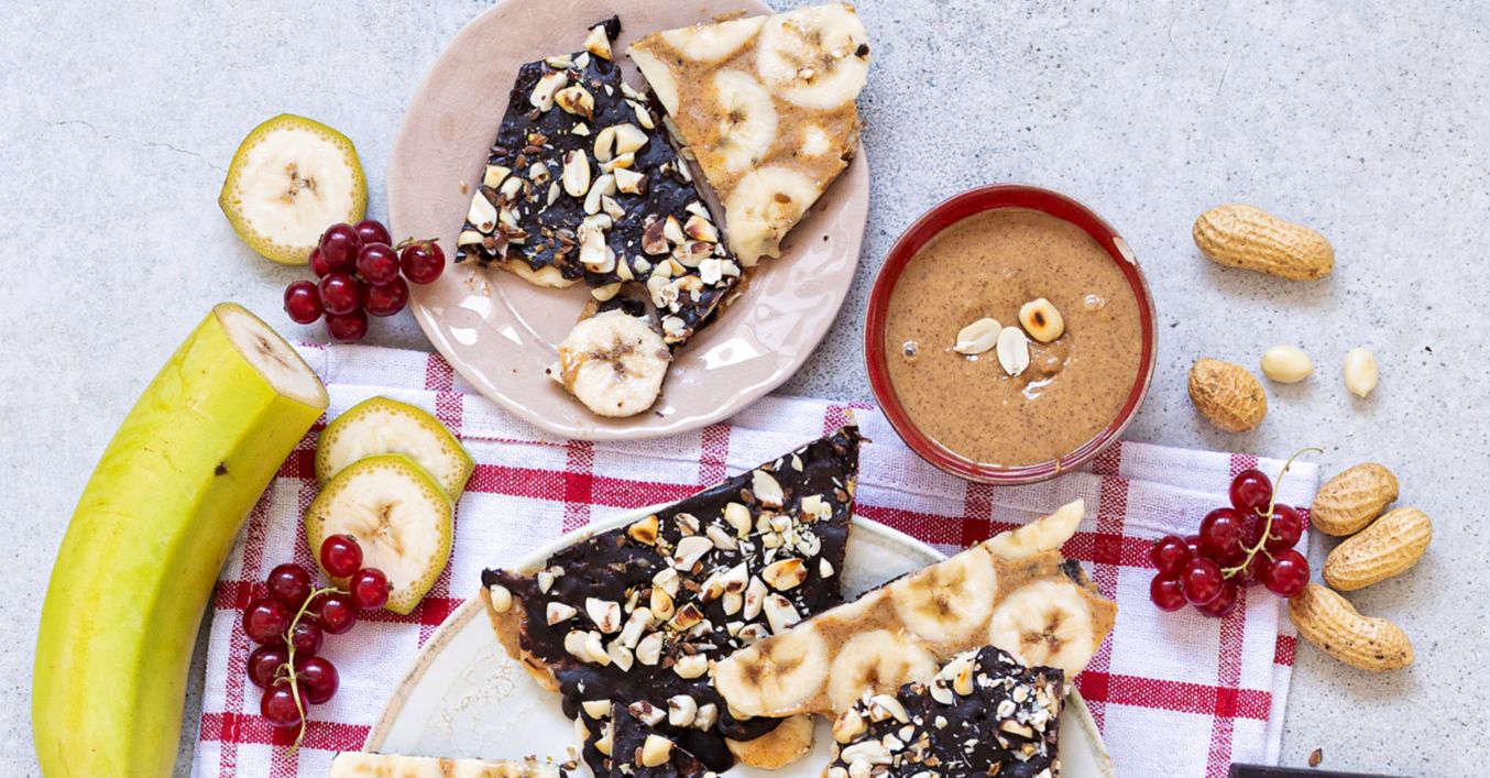 Na pečící papír rozložte vedle sebe kolečka banánu. Potřete je arašídovým máslem a poté čokoládovou polevou. Poté posypte nadrcenými arašídy.