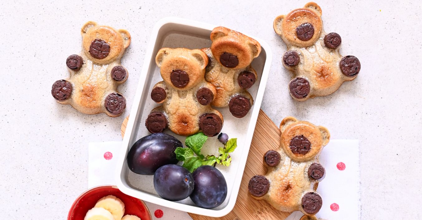 Do formy nejdříve dejte tmavé těsto do míst, kde mají medvídci ouška a tlapky. Poté vlijte světlé těsto.