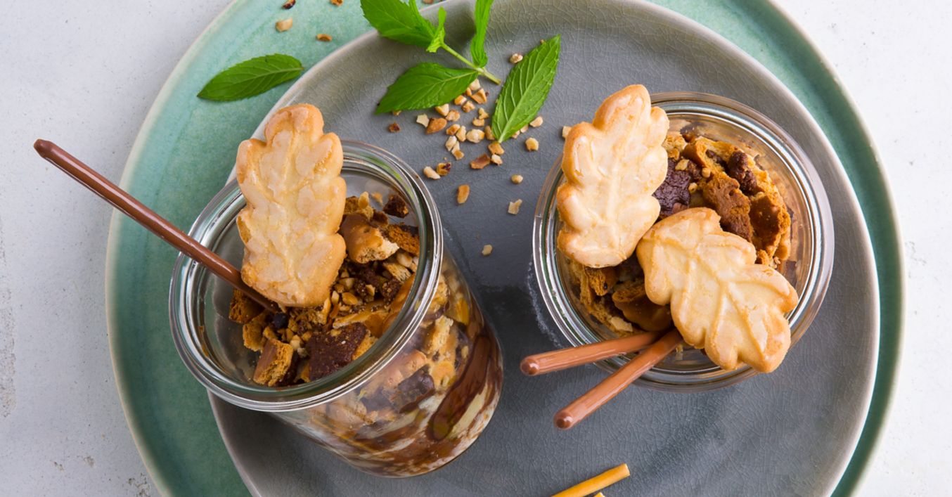Nakonec sklenice naplníme sušenkovo-oříškovou směsí. Drobenku pečeme v předehřáté troubě na 200 °C (horní/spodní ohřev: 180 °C) 12 až 14 minut. Vlažnou banánovo-čokoládovou drobenku ozdobíme tyčinkami Mikado a každou 1 lístkem máslových sušenek.