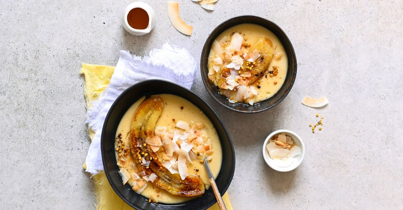 Vychladlý puding podávejte s opečeným banánem a kokosovými lupínky.