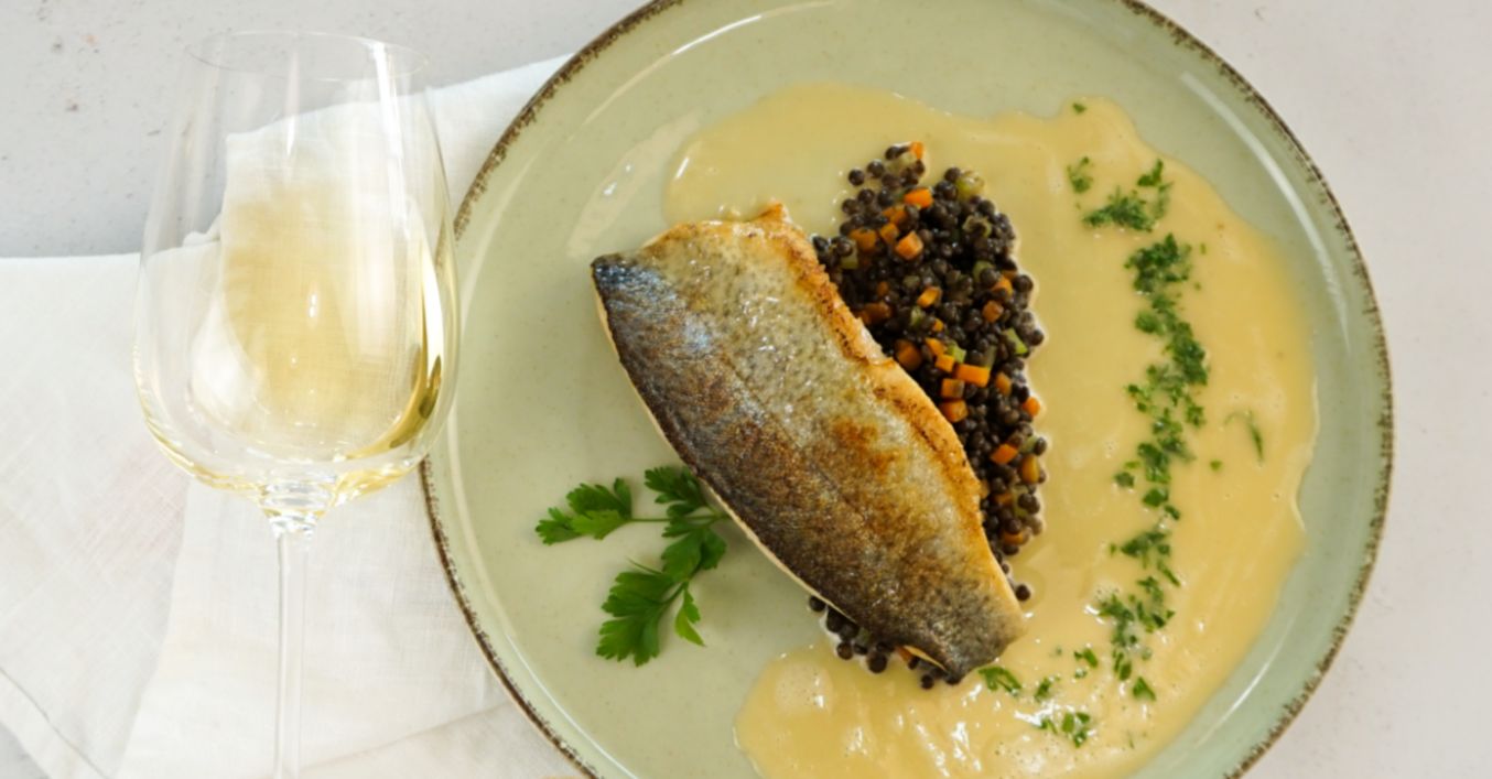 Na rozpálené pánvi rozpusťte kostičku másla a vložte na ni filety kůží dolů. Pokud by se filet kroutil, přitlačte ho na pánev, aby se rovnoměrně propekl. Jakmile je kůže osmažená dozlatova, stáhněte filety z žáru a vložte do pánve 2 lžičky másla.