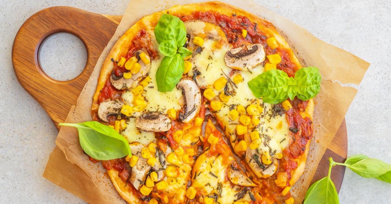 Korpusy potřete připravenou rajčatovou omáčkou. Poklaďte plátky žampionů, kukuřicí a mozzarellou. Pečte 15-20 minut v troubě vyhřáté na 230 °C.
