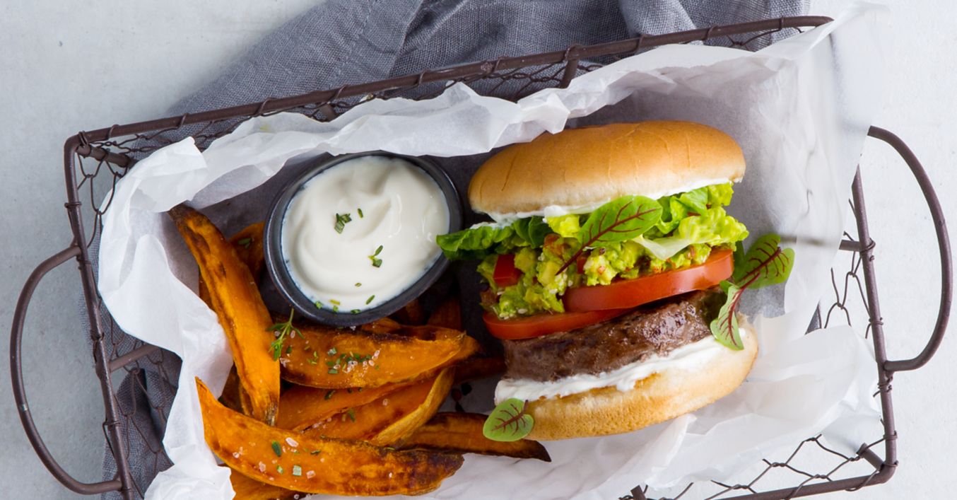 Housky namažeme zakysanou smetanou. Navrch položíme plátky masa a rajčat a každý potřeme dvěma lžícemi guacamole. Naplníme burger hlávkovým salátem podle libosti a podáváme s měsíčky sladkých brambor, zbylým guacamole a zakysanou smetanou.