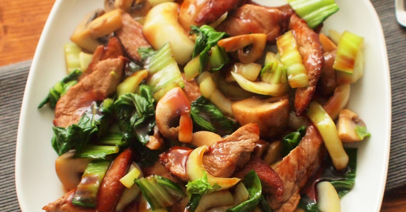 V pánvi rozehřejeme olej, přidáme maso a zprudka orestujeme dozlatova. Vmícháme cibuli, česnek a zázvor a dále restujeme (asi 3 až 5 minut). Zastříkneme sójovou omáčkou, vmícháme pak choi a znovu společně restujeme.