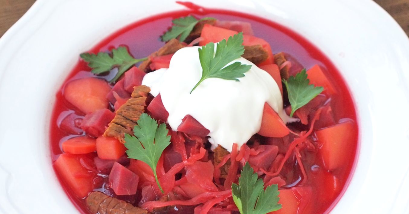 Přidáme kostky řepy a brambor a vaříme asi 15 minut. Nakonec přidáme nakrájené maso a zelí a dovaříme vše doměkka. Dochutíme solí a podáváme se zakysanou smetanou a čerstvým koprem do talíře.