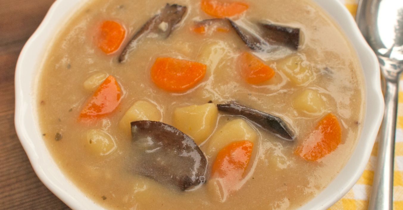 Sušené houby dáme do misky a zalijeme je hrnkem vroucí vody. Necháme je pak nabobtnat asi 15 minut. Zeleninu a brambory si očistíme, oloupeme a nakrájíme na kostky, cibuli na drobné kostičky.