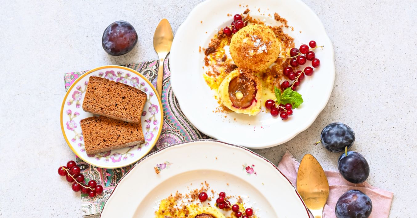 Uvařené knedlíky vyjměte děrovanou naběračkou. Na talíři je zalijte rozpuštěným máslem, zasypte nastrouhaným perníkem, moučkovým cukrem a skořicí. Podávejte s čerstvou mátou.
