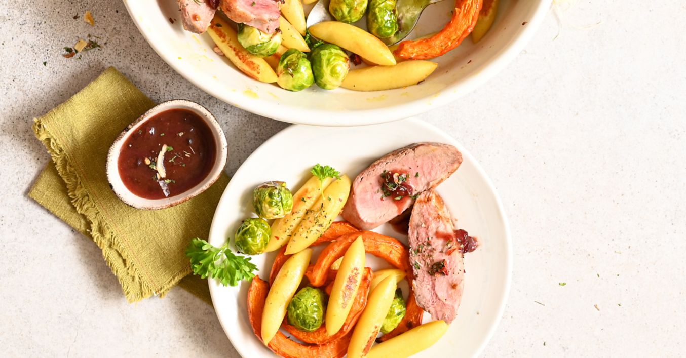 Prsa nakrájejte na plátky. Podávejte s pečenou zeleninou, špeclemi, omáčkou a čerstvou petrželkou.