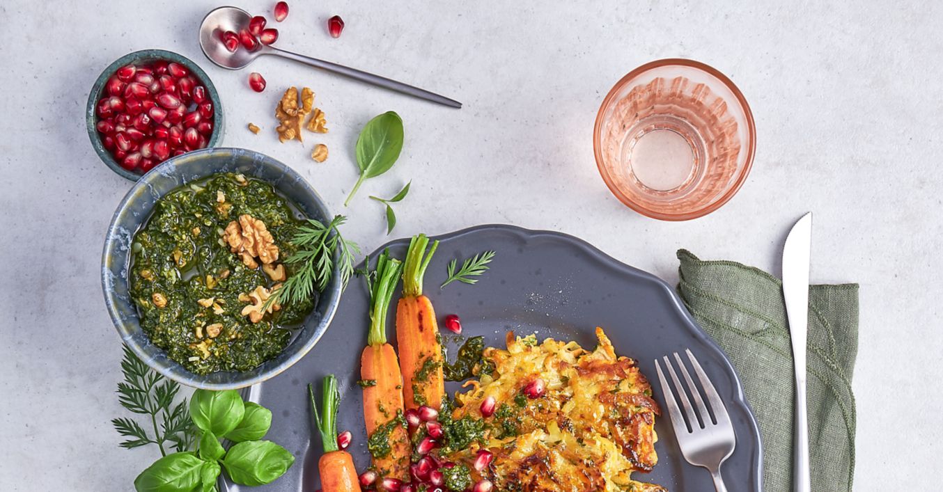 Nastrouhanou zeleninu osušte kuchyňskými ubrousky, nakrájejte 2 lžíce mrkvové natě, vmíchejte do nastrouhané zeleniny s vejcem, moukou a kukuřičnou moukou a dochuťte solí a pepřem. Na velké pánvi rozehřejte zbylý olivový olej a opékejte na středním plameni jednu po druhé 4–5 minut z obou stran.