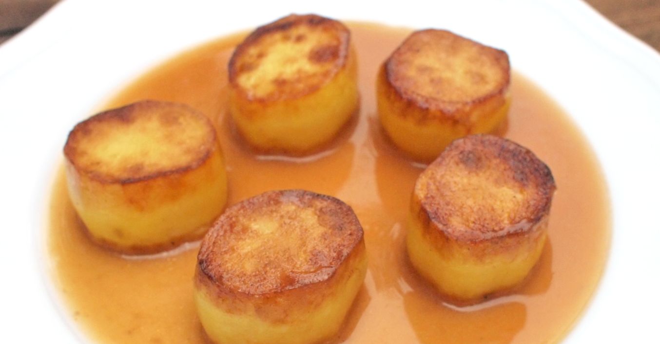 V širší pánvi zpěníme máslo, přidáme brambory plochou stranou dolů a opékáme dozlatova asi 5 až 8 minut na mírném plameni. Jakmile jsou brambory z jedné strany opečené, otočíme je a zalijeme vývarem.