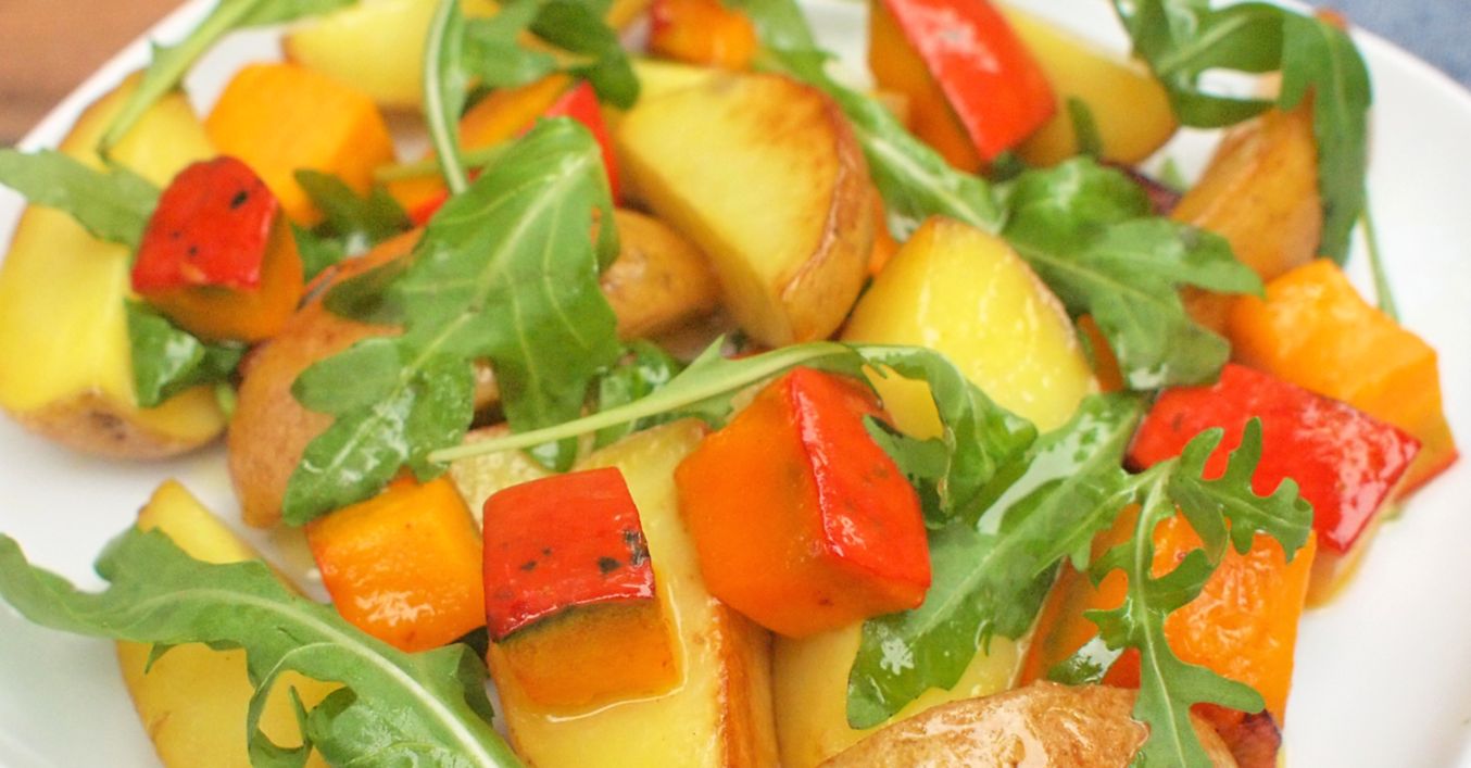 Pečeme v troubě rozehřáté na 190 °C asi 35 dozlatova. Upečené brambory s dýní poté promísíme spolu s rukolou, zakápneme octem a podáváme.
