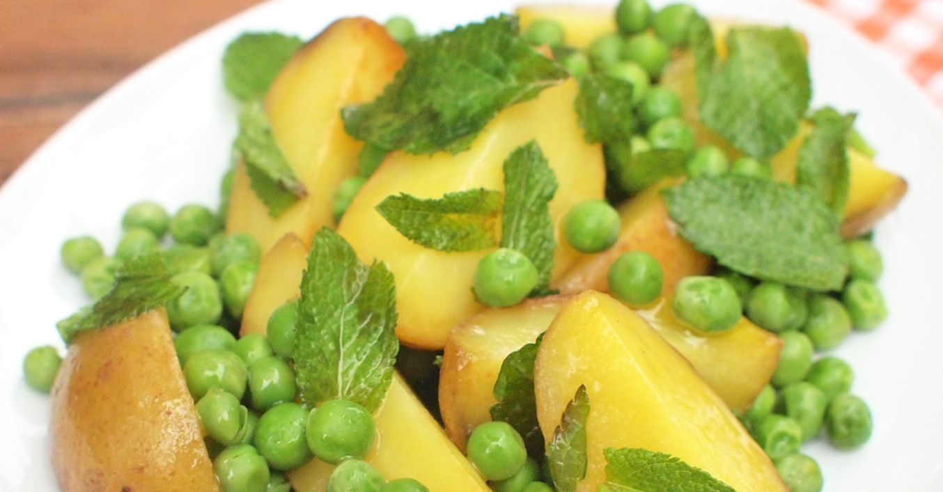 Pečeme v troubě rozehřáté na 190 °C asi 35 minut dozlatova. Ke konci do brambor vmícháme hrášek a máslo. Vrátíme do trouby a společně prohřejeme asi jen 5 minut.