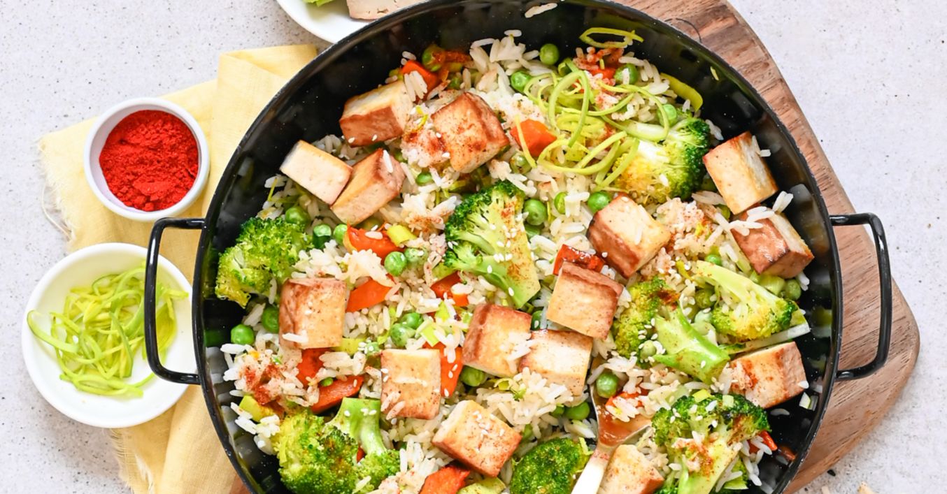 V pánvi rozehřejte olej. Orestujte nejdříve kostky tofu ze všech stran, poté je vyjměte a dejte bokem.