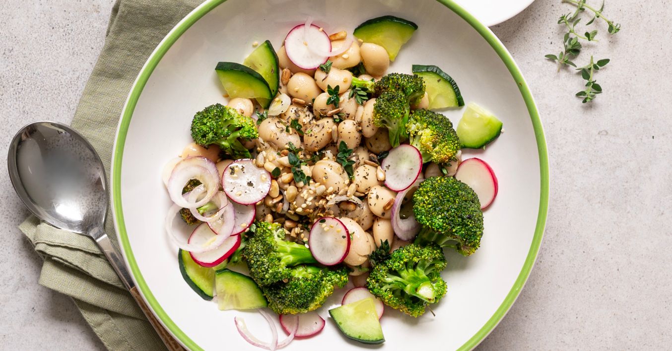 Orestovanou brokolici i s česnekem promíchejte s bílými fazolemi, octem, medem, hořčicí a najemno natrhaným tymiánem. Podle chuti osolte a opepřete. Salát ozdobte čerstvým tymiánem.