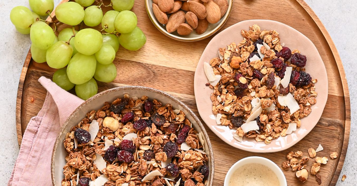 Upečenou granolu smíchejte se sušenými brusinkami a plátky kokosu.