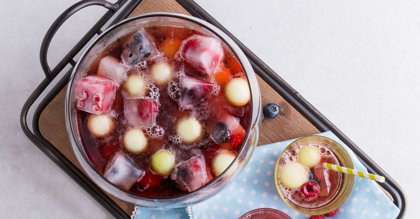 Melounové kuličky vložíme do mísy na punč, zalijeme dětským sektem, ozdobíme kostkami ledu a podáváme.
