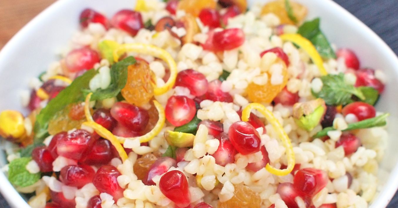 Uvařený bulgur scedíme a necháme chvíli okapat. Poté ho v míse smícháme s granátovým jablkem, mátou, rozinkami a pomerančovou kůrou. Promícháme a dochutíme olivovým olejem, citronovou šťávou a solí.