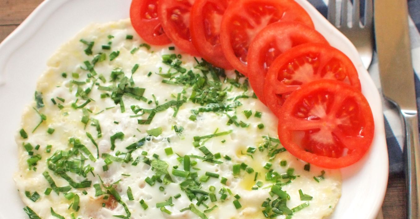 Na nepřilnavé pánvi rozehřejeme olej, přidáme bílky a rozprostřeme je rovnoměrně po pánvi. Bílky zasypeme bylinkami a pečeme na mírném plameni, dokud není omeleta rovnoměrně propečená.