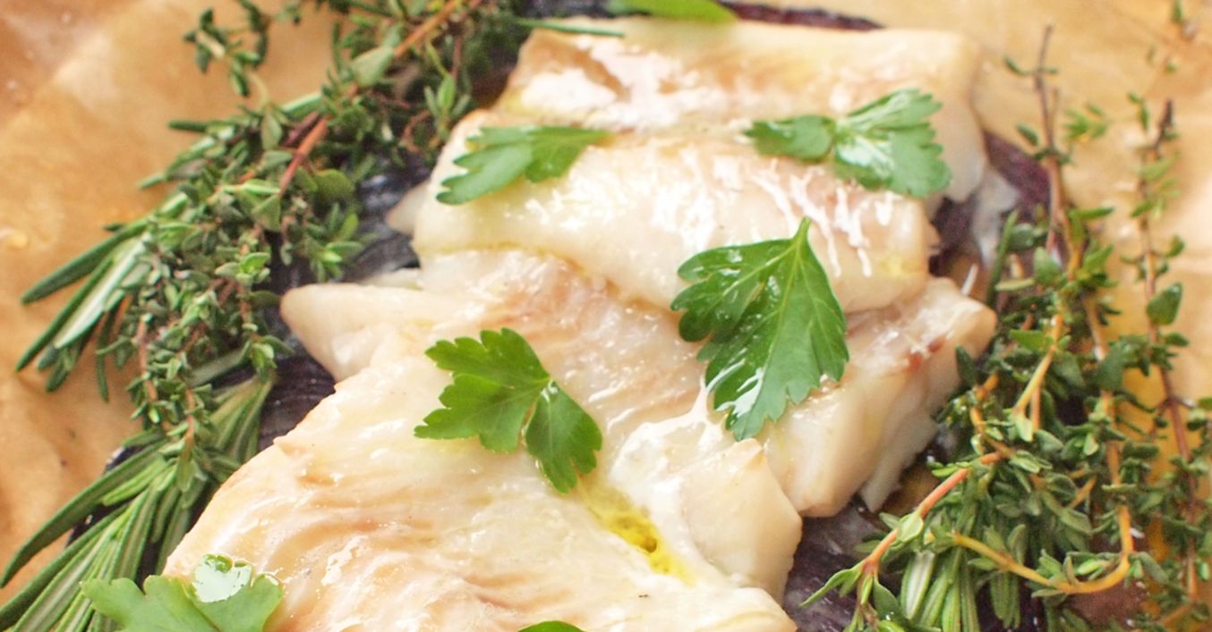 Připravíme si celkem 4 vetší čtverce z pečicího papíru. Na každý rozložíme šalotku, na ni položíme větvičku rozmarýnu a snítky tymiánu, přidáme filé z ryby a zastříkneme olivovým olejem. Papír okolo ryby přeložíme a s pomocí provázku svážeme na pevný balíček.