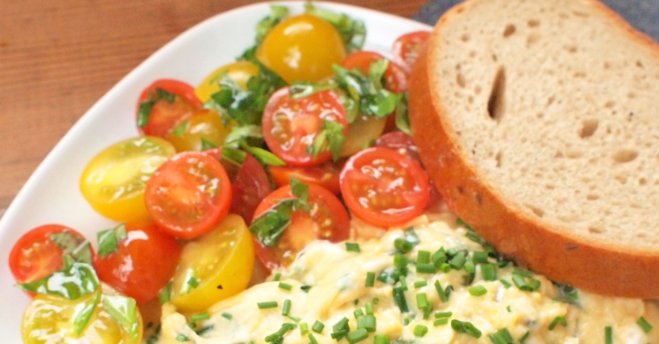 Vejce rozšleháme vidličkou v míse, osolíme a opepříme. V pánvi rozehřejeme máslo, přidáme vejce a za stálého míchání povaříme, dokud nejsou krémová. Vmícháme bylinky a podáváme spolu s rajčaty.