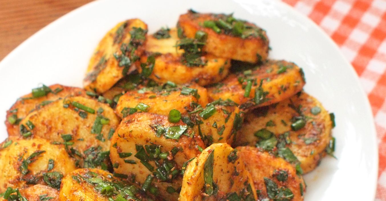 Bylinky očistíme, osušíme a nasekáme nadrobno. Usmažené brambory promícháme s kořením a s bylinkami. Ihned podáváme.