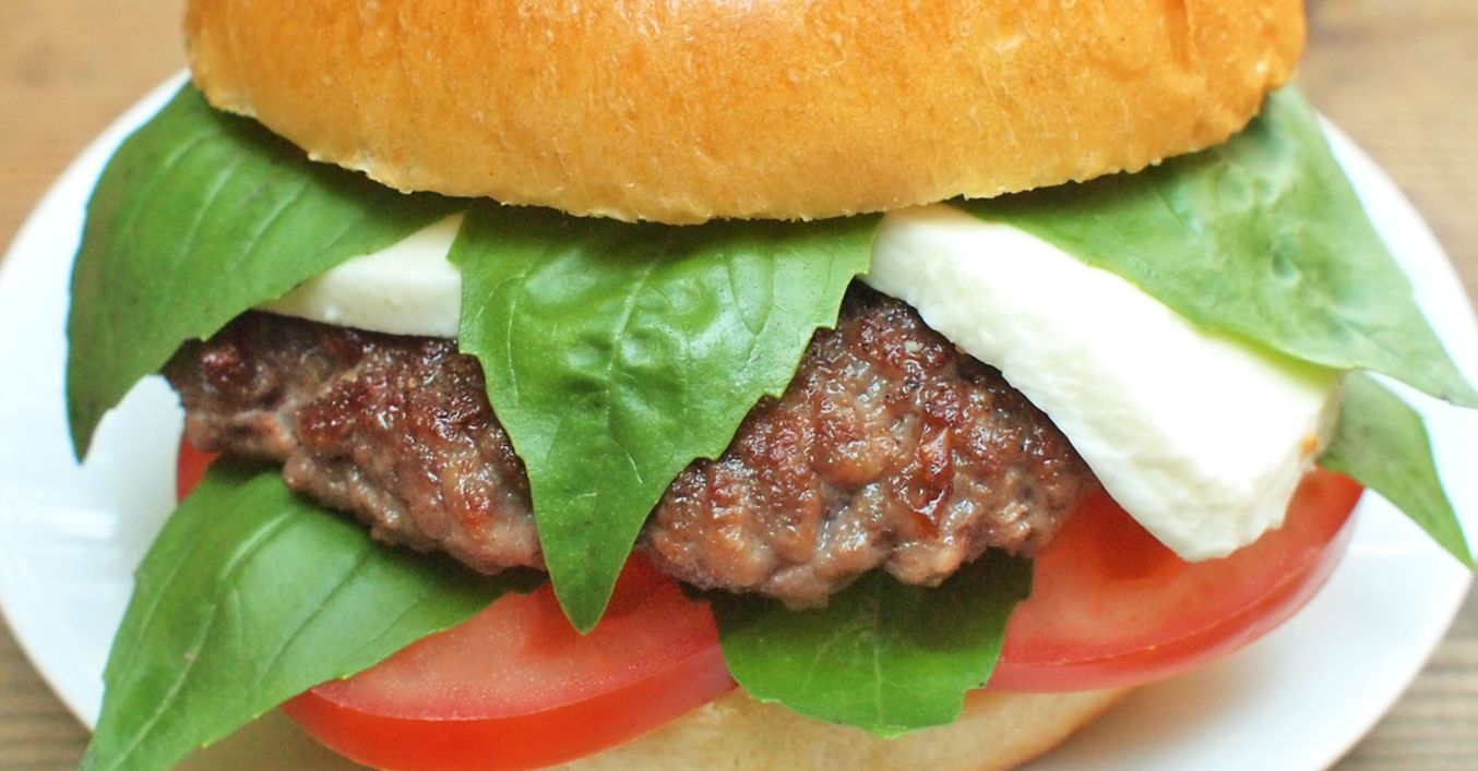 Na grilovanou žemli nandáme rajče, burger s mozarellou a dozdobíme bazalkou. Ihned podáváme.