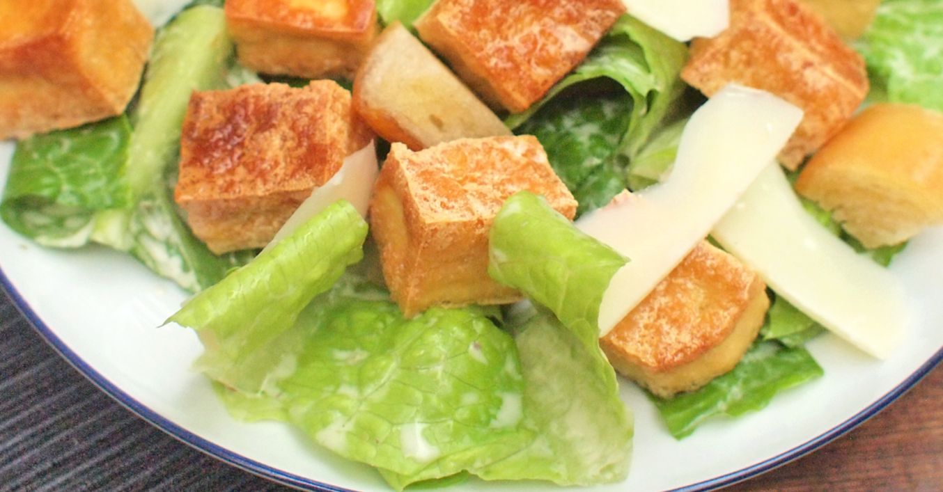 Na másle osmažíme nakrájenou žemli dozlatova. V míse důkladně promícháme salát se zálivkou a podáváme spolu s krutony a křupavými tofu kostkami