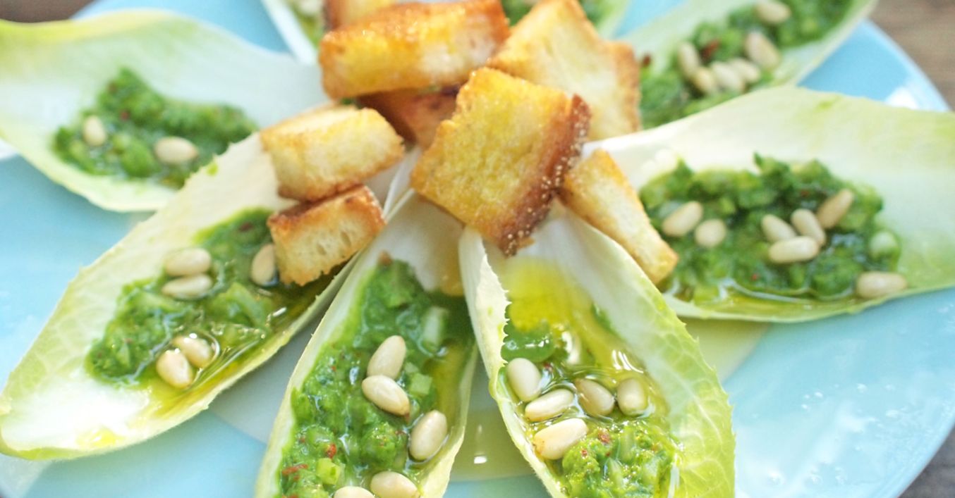Do každého listu pak nandáme lžičku pesta a trochu piniových oříšků. Podáváme spolu s krutony.