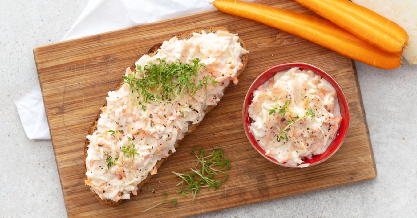 Celer, mrkev a jablko nastrouhejte nahrubo. Promíchejte s tvarohem, majonézou, solí a pepřem. Podávejte s řeřichou na plátku kváskového chleba.