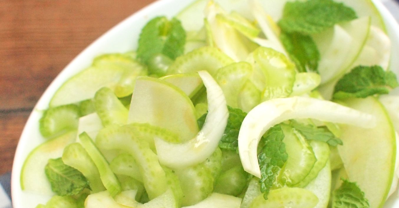 Řapíkatý celer rozebereme na řapíky, které dobře očistíme a osušíme. Celer poté nakrájíme na tenké plátky. Jablka očistíme, zbavíme jádřinců a nakrájíme na tenké plátky. Fenykl zbavíme stonků a tuhého středu. Poté očistíme a nakrájíme na co nejtenčí plátky. Mátu obereme, očistíme a osušíme.