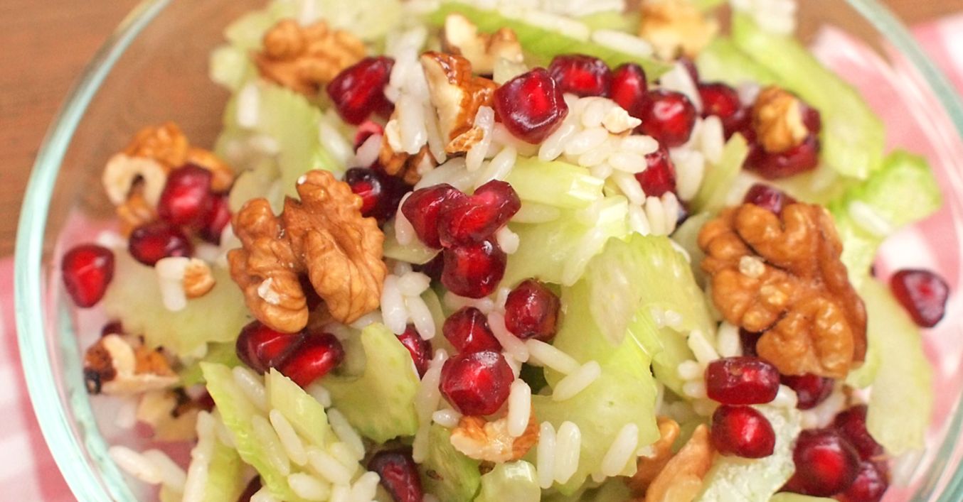 Rýži promícháme s celerem, ořechy, granátovými zrníčky a dochucujeme solí, pepřem, olejem a citronovou šťávou.