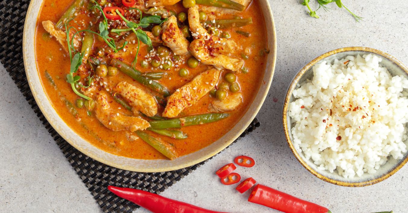 Červené kari s kuřecími nudličkami, fazolkami a hráškem