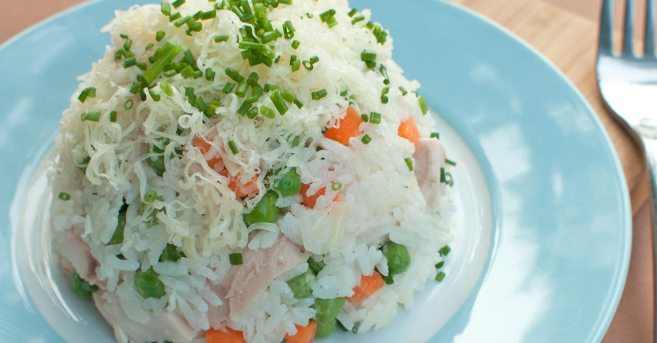Jakmile je rýže měkká, odstavíme ji z plamene a přidáme mražený hrášek a na kousky natrhané kuřecí maso. Promícháme, zaklopíme poklicí a necháme prohřát.