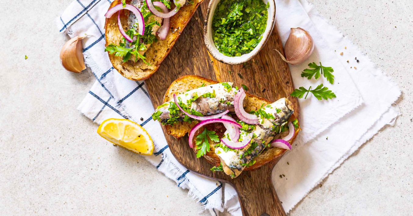 Na topinky dejte namarinované sardinky a kolečka nakrájené cibule. Hned podávejte.
