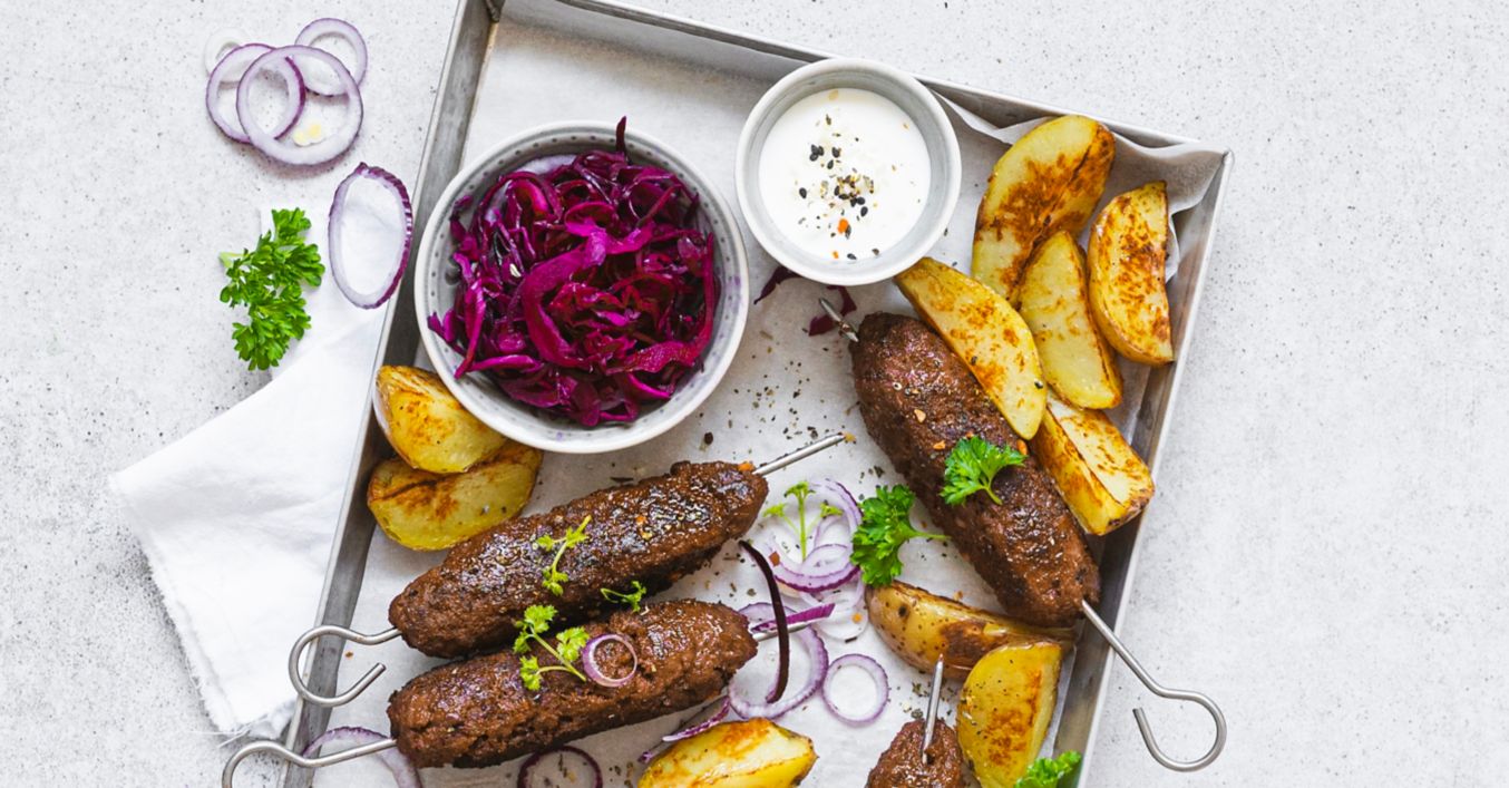 Čevapčiči podávejte se zelným salátem, upečenými brambory, kolečky červené cibule a čerstvou petrželkou.