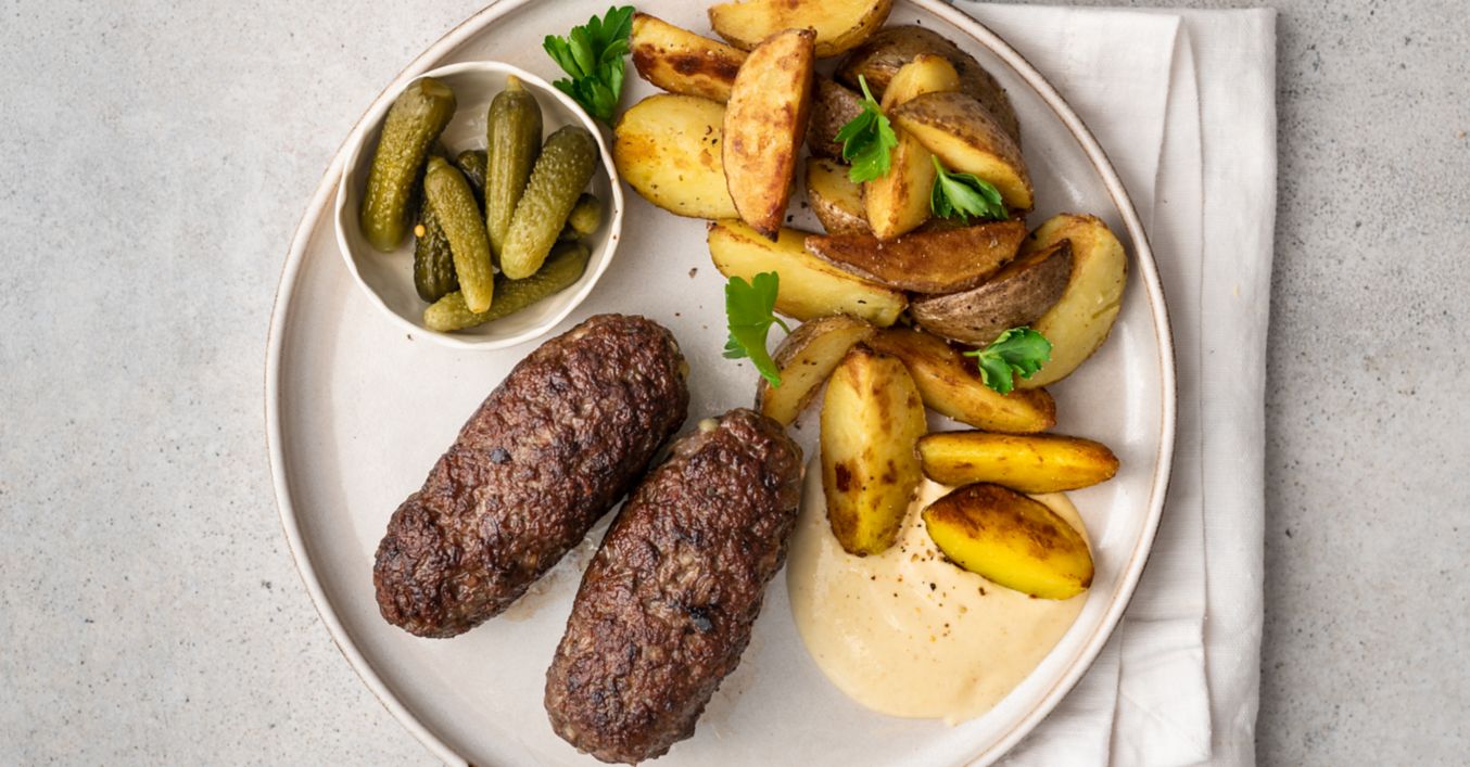 Čevapčiči s pečenými bramborami a hořčičným dresingem