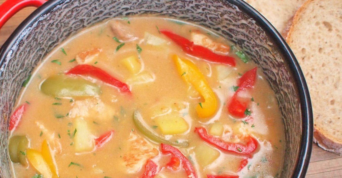 Zhruba v polovině vaření přidáme do hrnce i nakrájenou papriku a brambory. Ke konci podle potřeby dochutíme solí a pepřem. Odstavíme, vmícháme bylinky a podáváme.