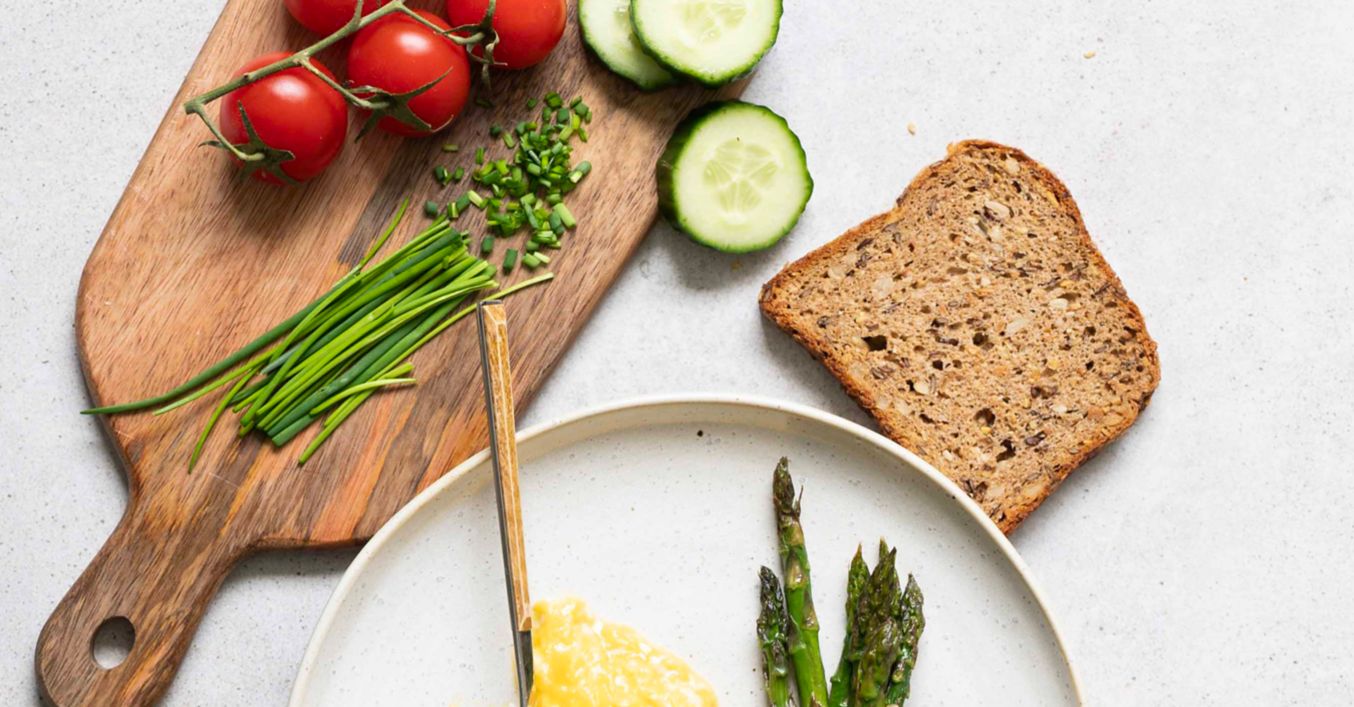 Vejce posypejte pažitkou. Podávejte s chřestem ve slanině, pečivem a zeleninou.